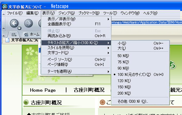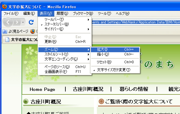 | 画面上部メニューの 『表示』 をクリックし、『ズーム』 を選択し、『文字サイズだけ変更』にチェックします。拡大・縮小・リセットの から、見やすいサイズをお選びください。 |