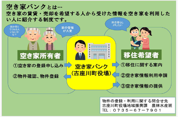 古座川町では町独自の空き家バンク制度を設けています。空き家バンクへの物件登録又は登録物件の利用の流れについては下記をご覧ください。